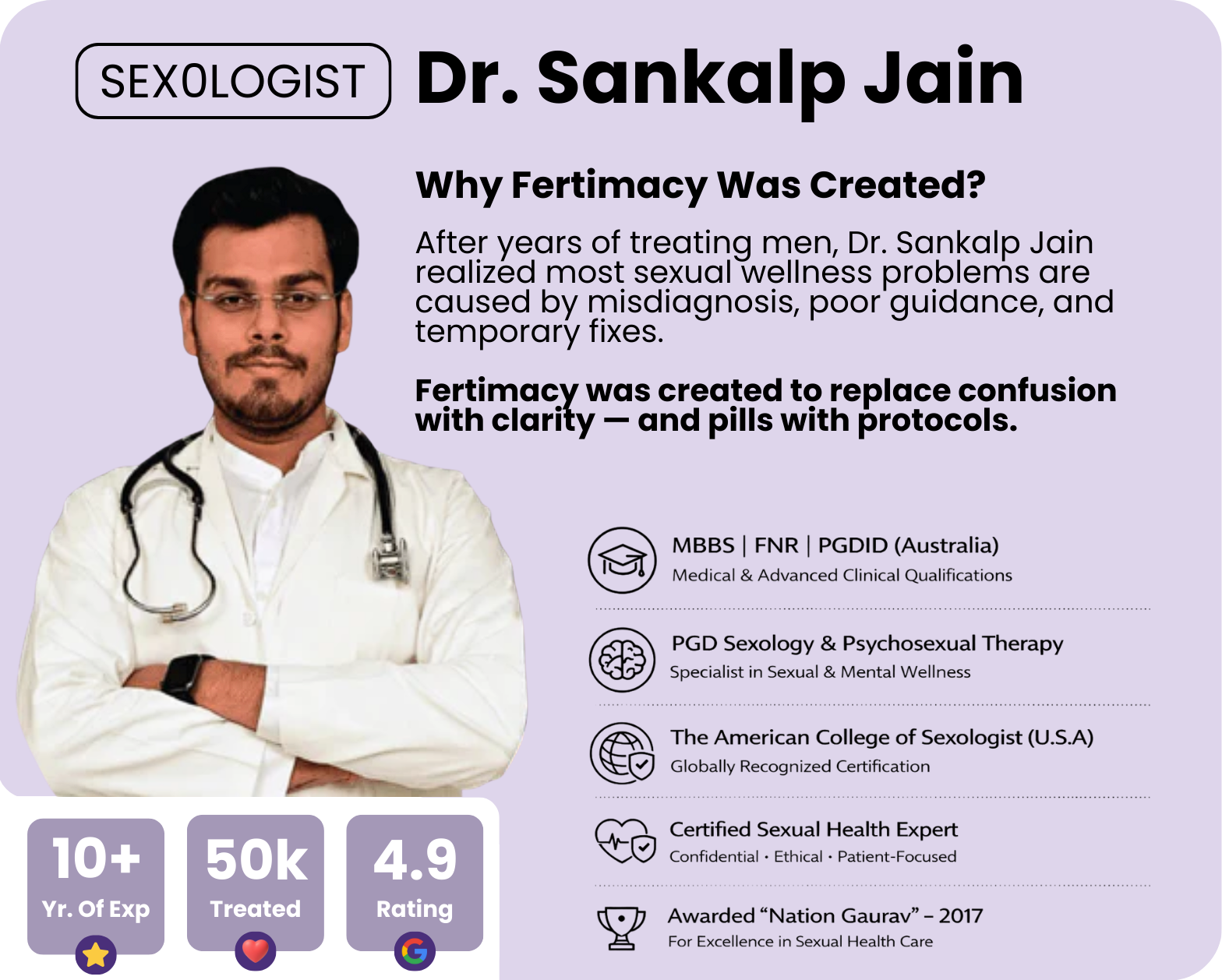 The Fertimacy Protocol is a personalized kit designed to help improve performance, confidence, and control naturally. With expert guidance from Dr. Sankalp Jain and a dedicated intimacy coach, it aims to enhance libido, vitality, and your overall well-being.